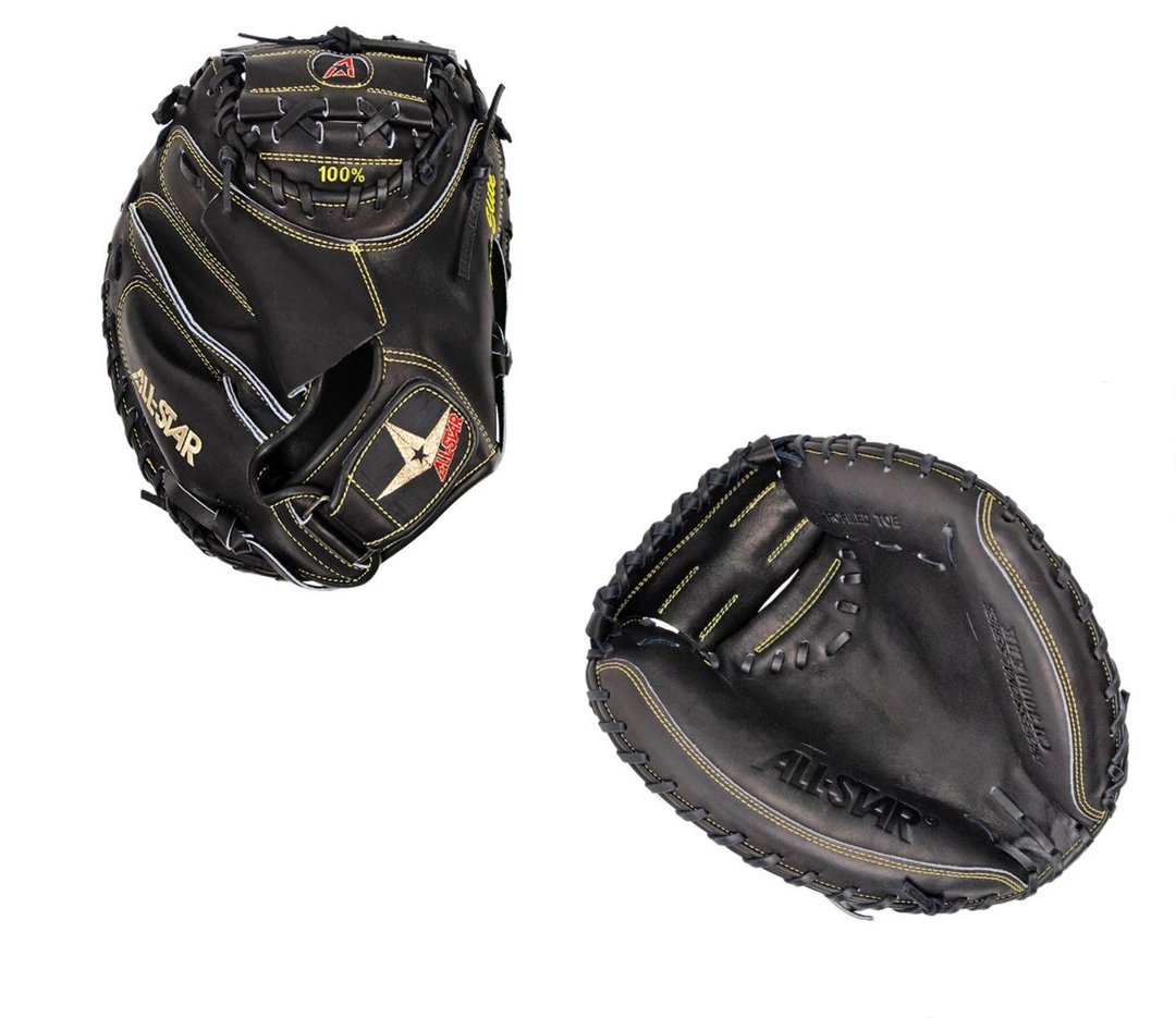 In 2011, Martin Maldonado started his professional career using the CM3000XSBK, All-Star’s 32″ mitt. No room for error with this small and precise mitt. Soon, Maldonado (“Maldy”) switched to our most popular 33.5″ size. He and several other All-Star Focus Team players asked for a little more room to receive the ball with confidence because pitchers are throwing faster and with more movement. In the 2017 season, Maldy used a custom 34″ mitt and won the Rawlings Gold Glove Award®. That year Martin sharpied 100% on the back of his web to remind him to give 100% of the pitches 100% of his attention and focus. Now you can own the same mitt that made him the top catcher in the game with this special edition release of our solid black CM3000 Pro-Elite® mitt in the same 34″ size Maldy uses. #goldmentality