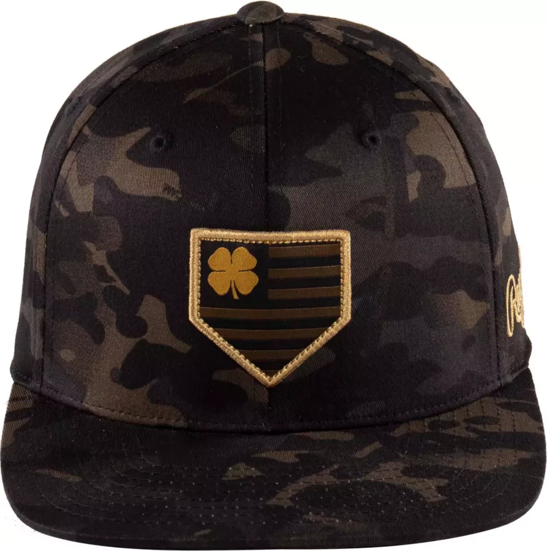 The Rawlings Black Clover camouflage snapback hat is a perfect combination of style and fit. Its gold trim woven ‘home plate’ patch adds unique flair to the modern camo look for an unmatched style.