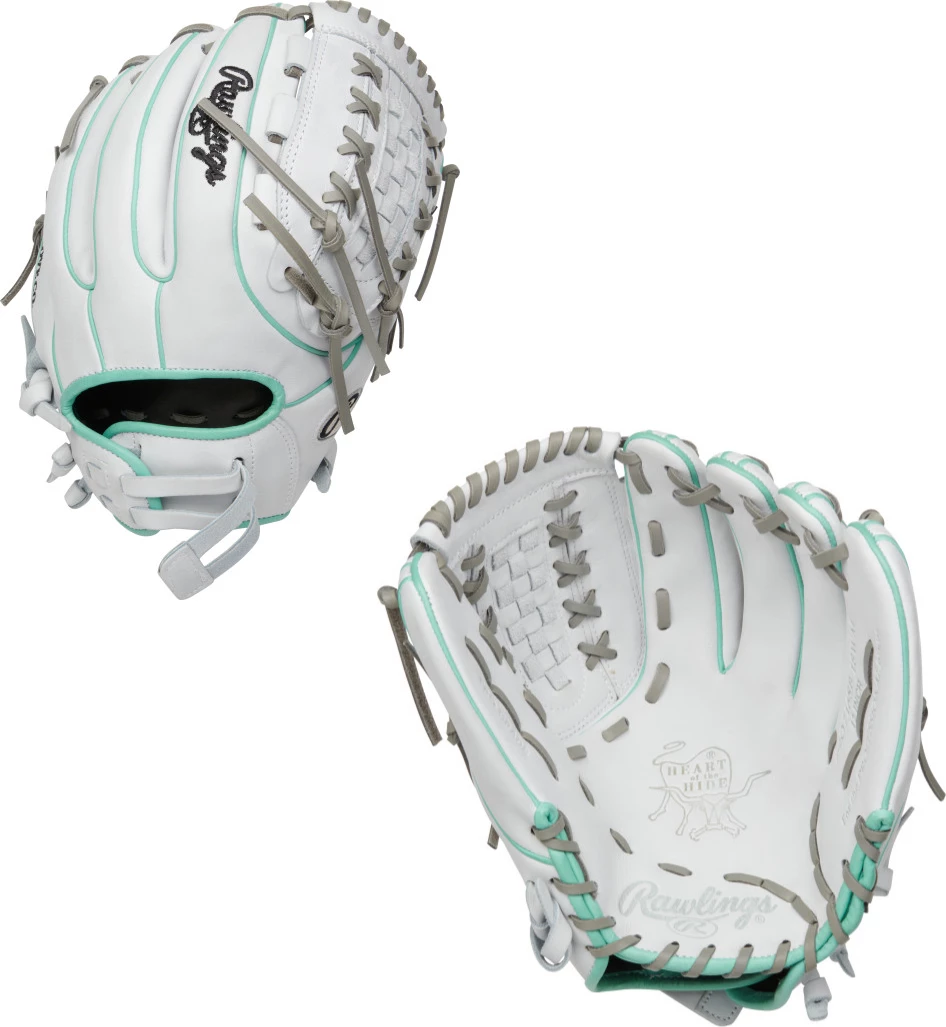 The PRO716SB Heart of the Hide 12-inch softball glove was artfully crafted using our 71-pattern. This popular softball pattern was designed specifically for the fastpitch player, to provide a better fit and feel – and deeper pocket. It’s crafted from our legendary HOH leather that’s world-renowned for its durability and performance. This white glove has the perfect touch of color, with beautiful ocean mint binding and welting. This blissfully compliments the basket connector web and gray lacing, to give you a subtle style all your own.