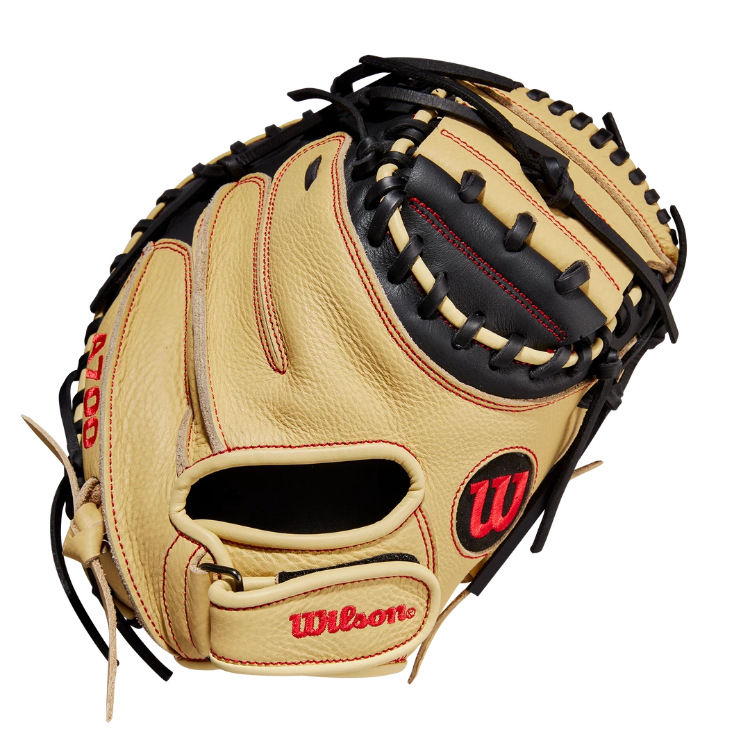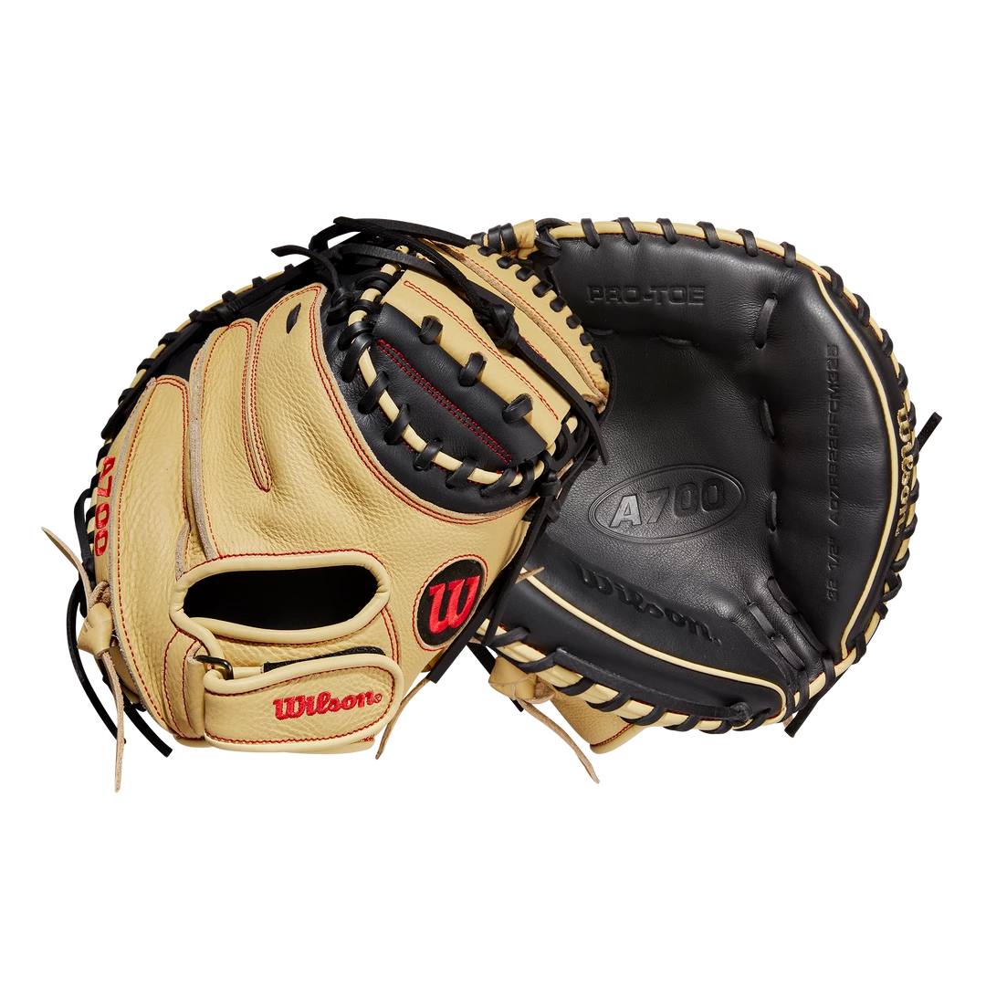 Improve your receiving and blocking skills behind home plate with the A700® 32.5” Catcher’s Mitt. Black and Blonde Full Grain leather with a Half Moon Web is game ready on day one, and the Pedroia Fit wrist features an adjustable strap for a secure fit.